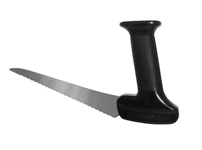 The Stirex ergonomic knife is ideal for cutting bread and vegetables. It features a generously sized grip handle, similar to our U-models, which ensures a comfortable and secure hold. The handle is positioned at an angle that promotes a natural, relaxed working position, minimizing wrist strain and transferring cutting power effectively to the blade. This design helps to prevent excessive strain and reduces the risk of pain and occupational injuries.